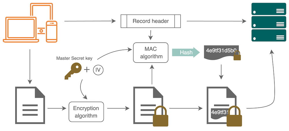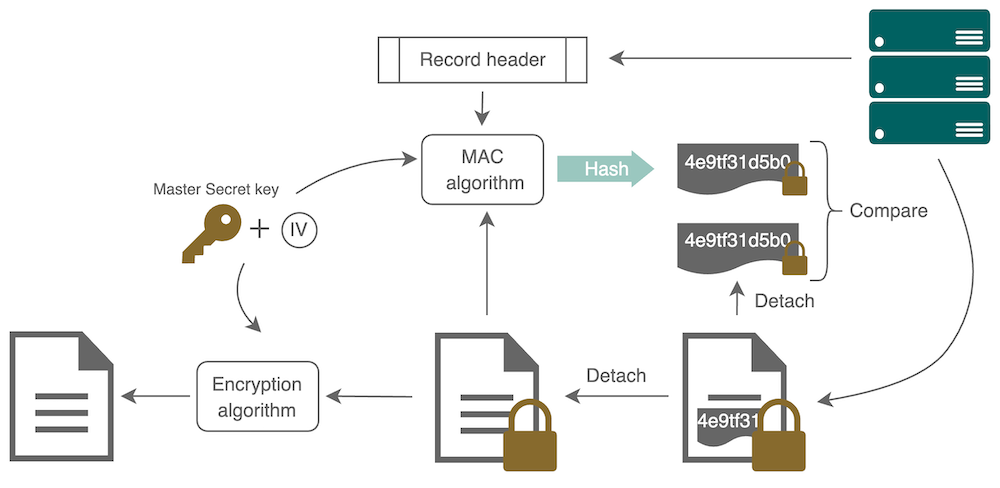 For each record, a computer also generates a nonce value known as an initialization vector (IV). It uses the IV value in conjunction with the Master Secret keys to encrypt the record payload and generate a message authentication code (MAC) for it. It also includes IV in the header so that the other computer can use it for decryption and MAC verification.