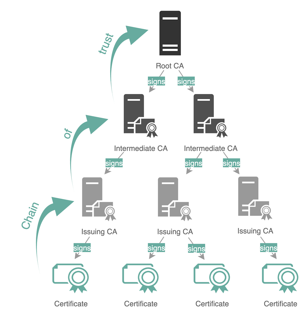 In fact, there are numerous certificate authorities, and they form a hierarchy with Root CAs at the top, Intermediate CAs in the middle, and Issuing CAs at the bottom. Issuing CAs sign user certificates while they also have their own certificates signed by Intermediate CAs, which in turn have their certificates signed with Root CA private keys. This system is called a chain of trust.