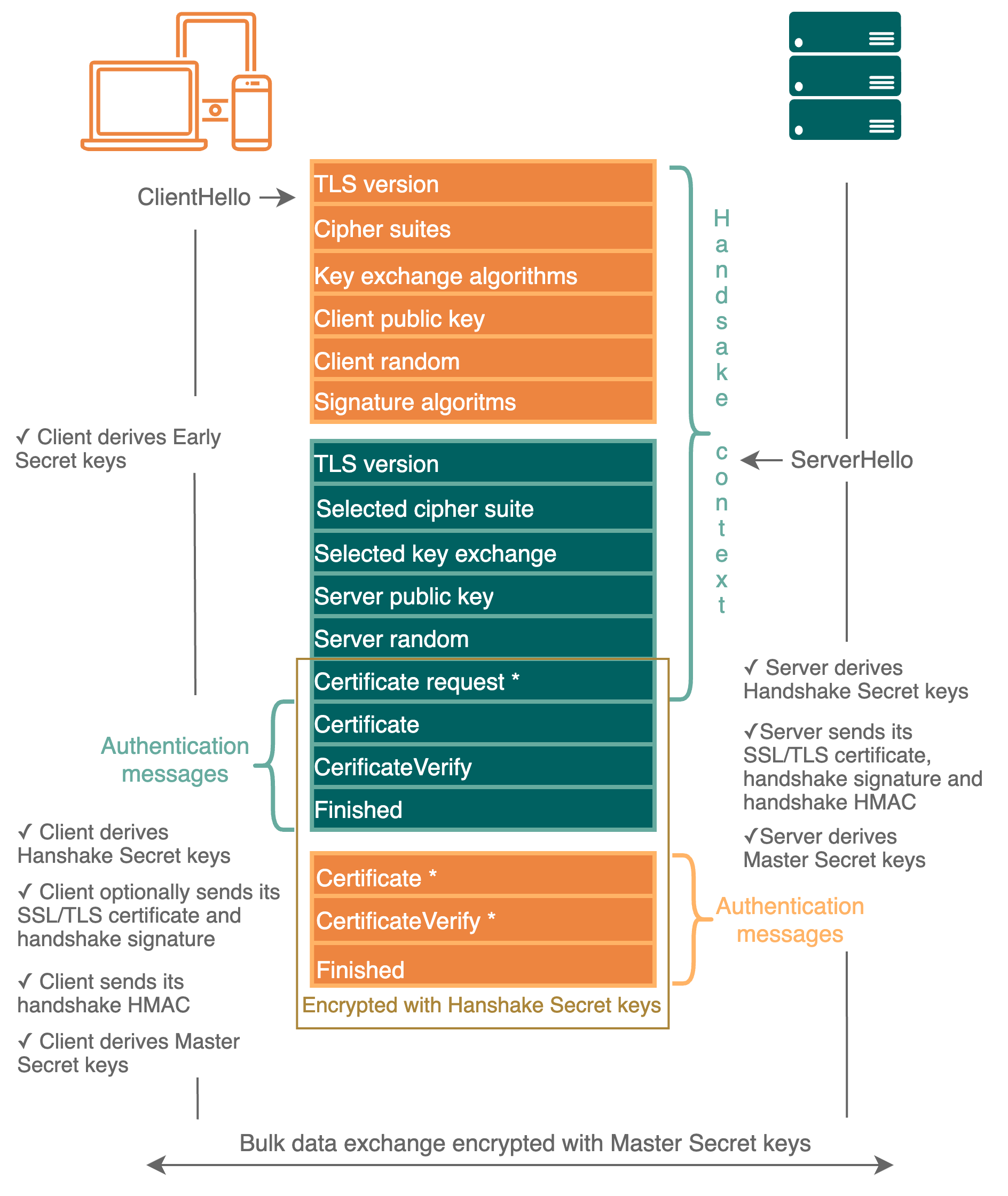 You can review the summarized flow of the basic full handshake in the graphic below. Optional elements are marked with an asterisk (*).
