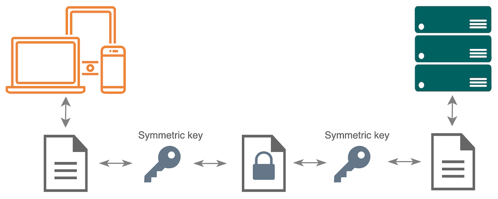 Symmetric cryptography handles encryption and decryption with a single key or set of keys. TLS uses it in the record phase to protect communication session traffic. This cryptography type is efficient to process large amounts of data, and it is safe as long as only the sender and receiver have the symmetric key that encrypts the data in transfer.