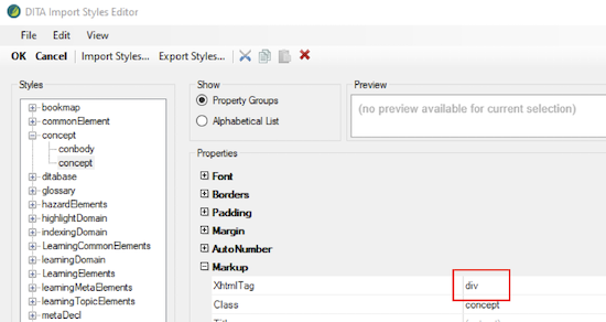 For example, under concept, select concept and change the XhtmlTag value to p.